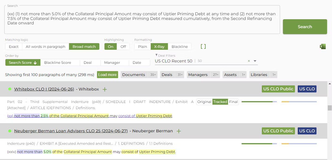 And if you are interested in searching across documents for similar language in deals where a defined term may not be explicitly defined, Semeris Docs' READ-FIND-COMPARE comes in handy once again. The screenshot below shows the Text Search screen from the Semeris Docs platform with an Uptier Priming Debt search. Simply pasting an example of target language and setting the text search to 'broad match', a user can quickly find all documents in a user-defined basket that have similar language, with results ranked by similarity. Such comparisons would be very time-consuming or nigh impossible using a conventional pdf "Ctrl-F" based search, with a lot of copy and paste. In our analysis for this article, we had the core results available for download in seconds with a few simple mouse clicks. See the screenshot below.